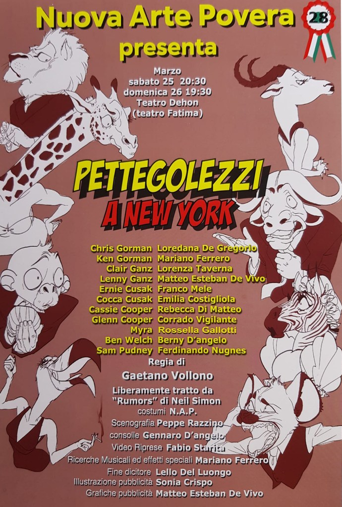 Ero cosciente di dover affrontare un compito impegnativo e sconosciuto. Al massimo avrei rinunciato: “scusate, non fa per me!”. Invece è stato come essere catapultato nelle acque tumultuose di un fiume in piena! Le esperienze si sono succedute in una sequenza fittissima, imprevedibile! specie per un neofita come me. Stavo appena prendendo confidenza col mio personaggio, quando Gaetano mi ha offerto un ruolo anche in un’altra commedia, un lavoro del tutto diverso, ancora più complicato. Dal niente, due commedie insieme! Impostare la voce, variare i toni, memorizzare battute e posizioni, non impallare gli altri, come un idiota, caso mai pure di spalle alla platea…